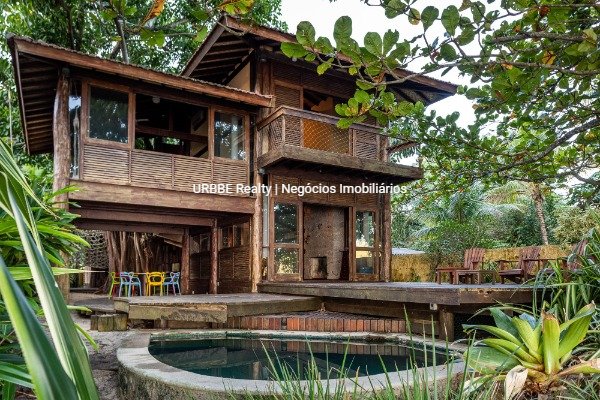 1 suíte com vistas para o mar e os outros 2 dividem um banheiro inteligente ( banho, vaso sanitário e pia separados). Uma sala de estar/ tv no mezanino e no térreo , sala de estar com cozinha e sala de jantar. Tem um quarto para empregadas, mas que pode ser mais um quarto se necessário. A casa, projetada por Marcos Acayaba, arquiteto paulista, preocupado com preservação e bem estar, tem sua sustentação em majestosos pilares de aroeira e é suspensa, não encosta no solo, proporcionando uma ventilação natural na casa toda.